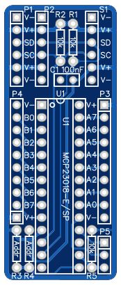This module houses a MCP23018 and provides 16 quasi-bidirectional input/output lines. Each I/O line can be driven low by the MCP23018 or pulled low by an external signal. The state of the I/O lines can be written and read by an I2C bus master.