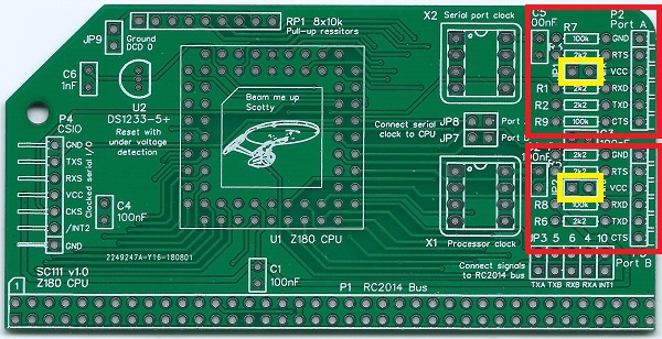 If you wish to experiment with this option, fit a suitable oscillator in position X2. Also, fit jumper shunts to both JP7 and JP8, indicated below in yellow. In addition, you will need appropriate firmware to match. This requires study of the CPU’s datasheet!