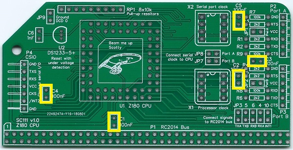 Fit and solder the 100k resistors R7 to R9 (shown in yellow below).