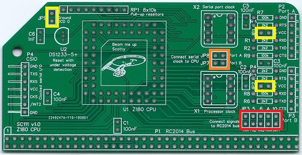 If the system is to be powered from one of the serial ports, fit a jumper shunt in one of the positions indicated in yellow below. The default port is normally port A, so JP1 is the most likely position to fit a jumper shunt.