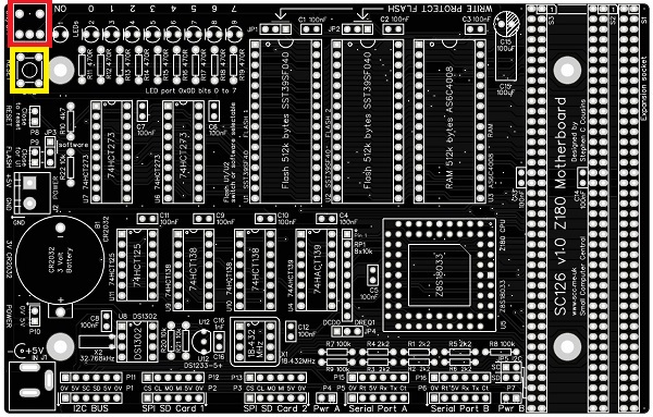 Connect the 5 volt supply and turn on. The firmware in socket U2 will now run. This will usually be either RomWBW or the Small Computer Monitor (SCM).