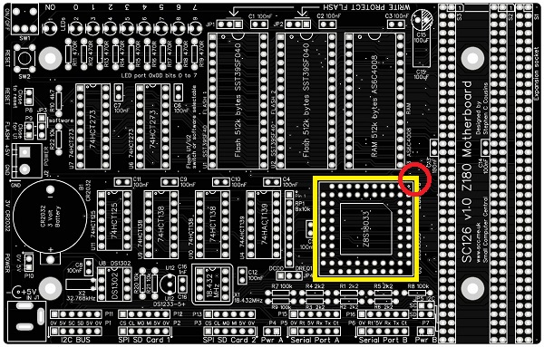 Fit the Z180 CPU into its socket as illustrated to the right. This must be fitted the correct way around. The socket and IC both have a small chamfer in the position indicated.