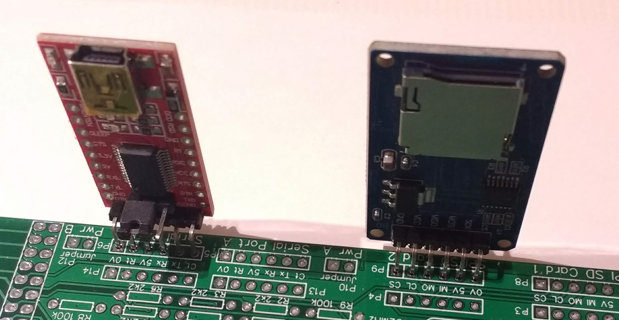 Serial ports and SPI ports (typically used for micro SD cards) are connected with adapters as shown below. The adapters could be soldered directly to the motherboard, plugged into sockets on the motherboard, or connected via cables to header pins on the motherboard. The choice is yours.
