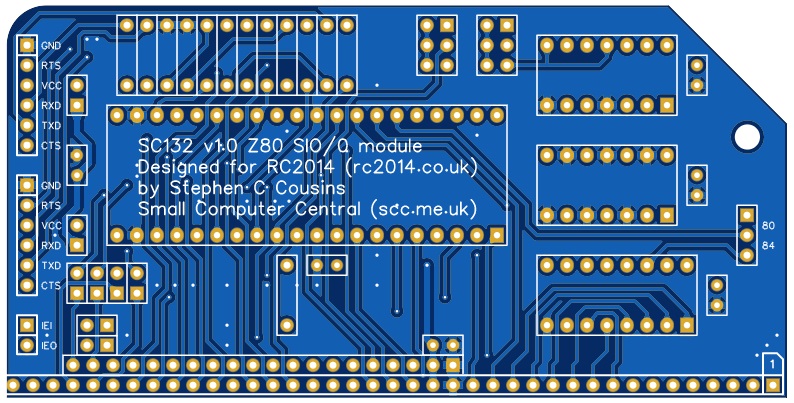 SC132 is a two channel asynchronous serial interface module based on a Z80 SIO/0 and designed for the RC2014 bus.