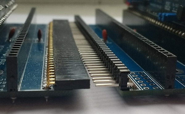 If the bus header plug is a modified 2-row angled male header, the second row needs to be removed. A modified 2-row header is used instead of a single row header as the pin position matches the single row socket, as illustrated below, while the common single row header does not. Single and double row headers, and how to modify them, is explained here.