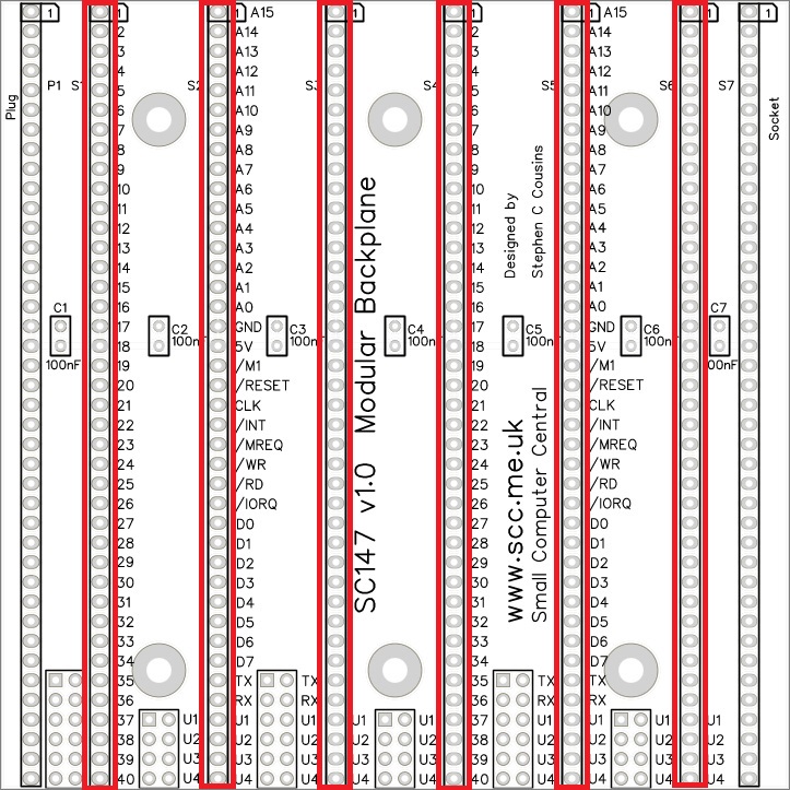The backplane has 6 vertical and 1 horizontal RC2014 bus compatible 40-pin module sockets. RC2014 bus compatible modules can be connected to any of these sockets.