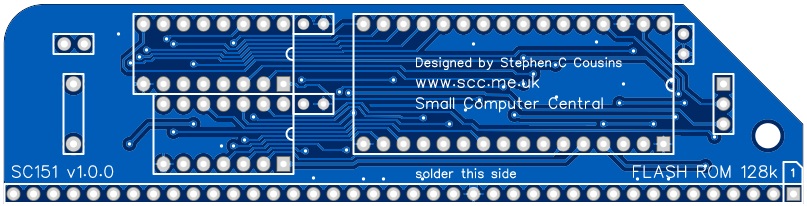 SC151 is a 128k byte paged FLASH ROM module designed for the RC2014 bus. It is primarily intended to be used with the paged RAM module (SC150). Together these modules provide suitable memory for running CP/M.