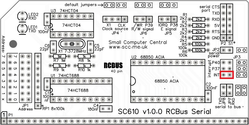 Jumper JP3 enables the ACIA’s interrupt output to be connected to the bus signals INT, INT1 (bus pin 37) or INT2 (bus pin 40). The default position is INT.