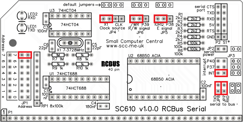 JP5 and JP6 enable selection of the ACIA’s R/W and E inputs. Normally these are set to the IORQ and WR signals that are common to all implementations of the RCBus. Alternative, if the processor supports native R/W and E signals then these can be selected instead.