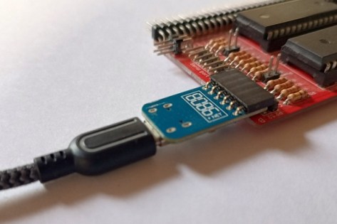 Both firmware options assume a terminal (or computer running terminal software) is connected to serial port A. Typically, this is achieved with a USB to serial adapter (the small PCB shown below) connected to the computer with a USB C cable.
