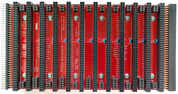 SC710 is an RCBus modular backplane with 12 vertical bus sockets, 1 horizontal bus socket, and one horizontal bus plug.