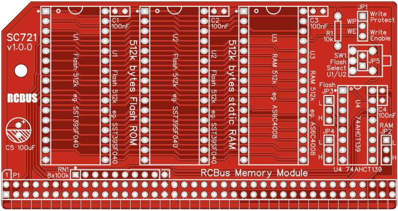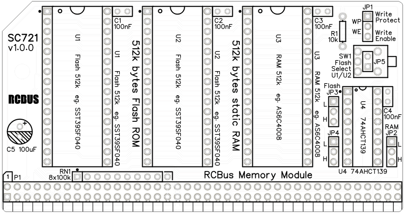 SC721 is a 1 MB memory module designed for the 80-pin RCBus. It includes 512 kB RAM plus a choice of two 512 kB Flash ROMs. The memory is arranged as a simple linear memory (no paging or banking) so it requires a 20-bit address bus to accesses all of the memory. This makes it suitable for use with a Z180 CPU module, but unsuitable for use with a Z80 CPU module (unless it has a memory management circuit included).