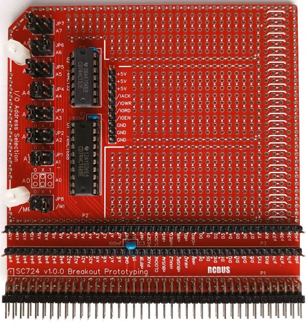 As a breakout module it provides easy access to all bus signals as well as configurable device enable, device write, device read and interrupt acknowledge signals. Typically these will be accessed with dupont cables connected to P2, P3 and P4.