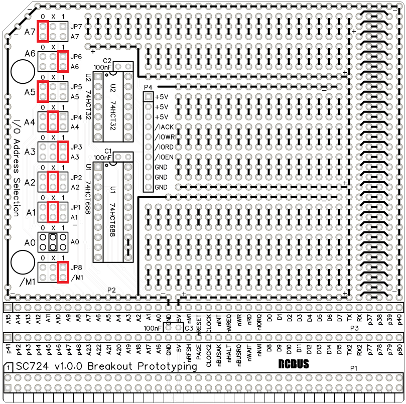 In the example below, jumper shunts fitted in the highlighted positions select the address of an input/output device as binary 010X 1XXX with /M1 high, where X is don’t care (either high or low). In hexadecimal the address range selected is 48 to 4F, with a ghost address range of 58 to 5F. The ghost address range exists because A4 is don’t care and is typical of modules that don’t have tight address decoding. For example, when a 74HCT138 is used for address decoding. The 74HCT138 only has seven inputs and can not fully decode some address ranges.