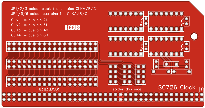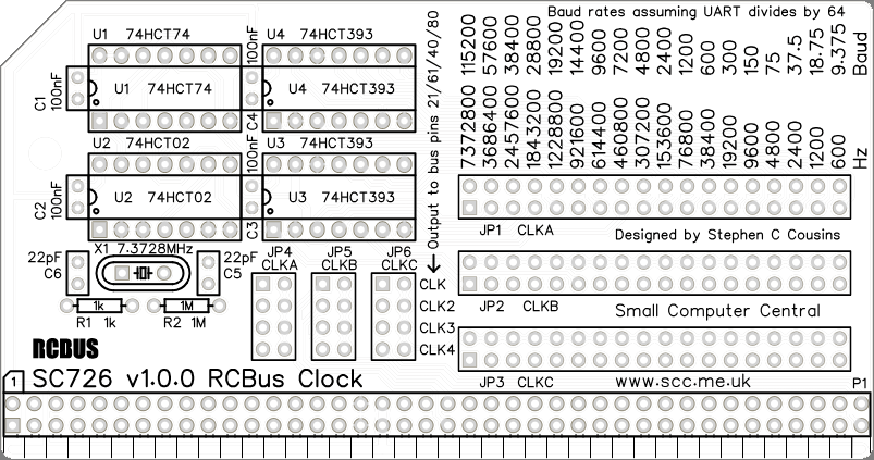 SC726 is clock signal generator designed for the RCBus. It provides a wide range of cock frequencies which can be connected to various pins on the RCBus, including the main CPU clock (CLK), the second bus clock (CLK2) and two user pins (USER4 and USER8). The second bus clock is usually used as a baud rate clock for serial modules.