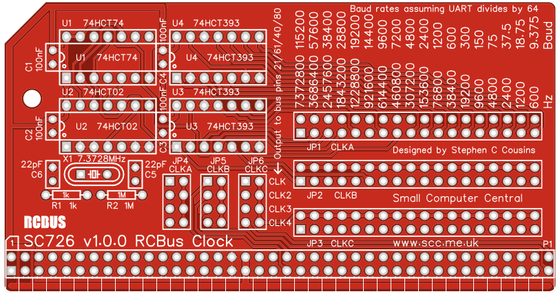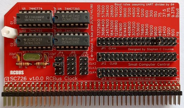 SC726 is a triple output clock generator designed for the RCBus. It provides a wide range of clock signals that can be output to various bus pins. Typically, these are used as the CPU clock and/or serial port baud rate clocks.