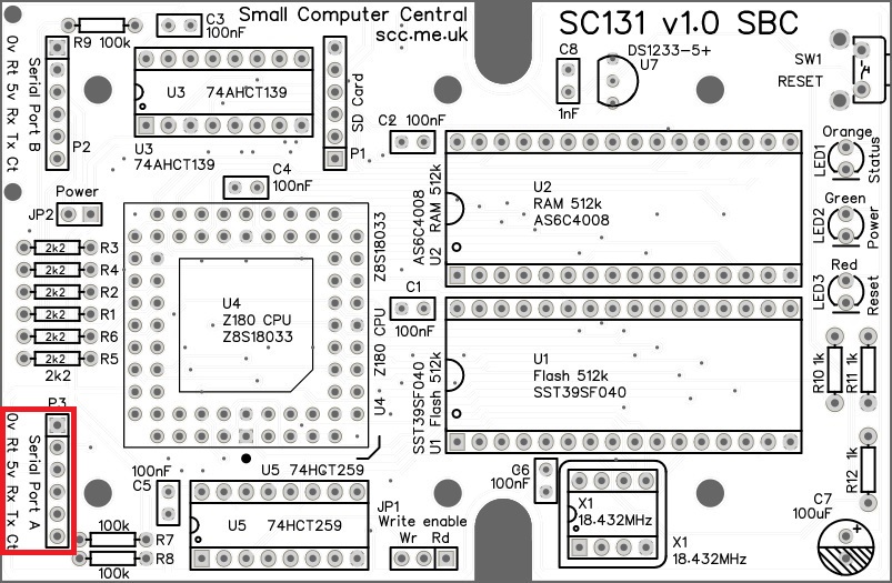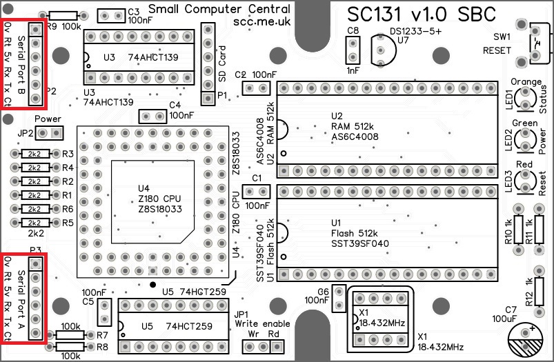 Serial ports A and B are connected via P2 and P3. These are FTDI style 5 volt serial ports. Port A includes RTS/CTS flow control signals, while port B does not.