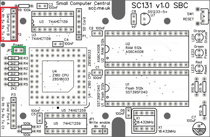 The board can also be powered from the serial port B. This requires a jumper shunt fitted to JP2 to connect power from serial port B.