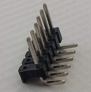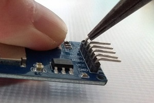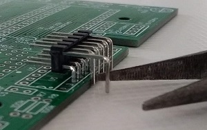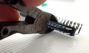 If the header strip is longer than 6 pins, first cut off two sections of 2 rows by 6 pins each. A pair of long nose cutters works well here.