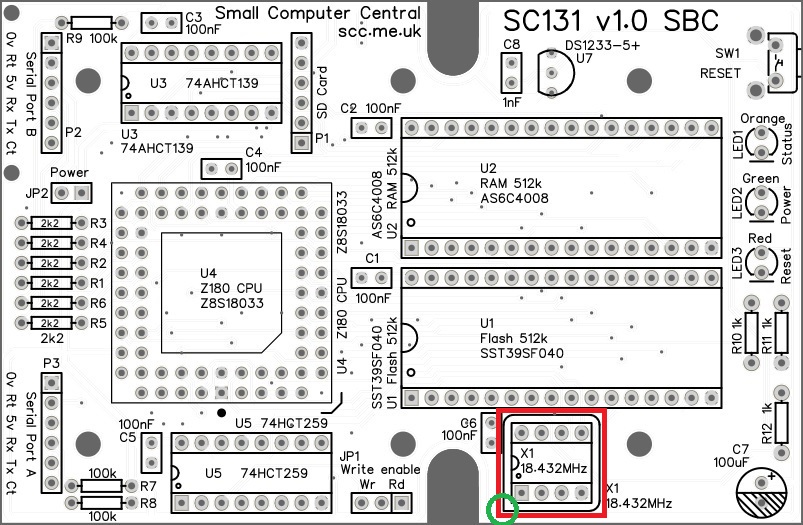 Fit and solder the 18.432 MHz oscillator, X1. Be sure to fit it the correct way around.