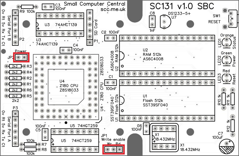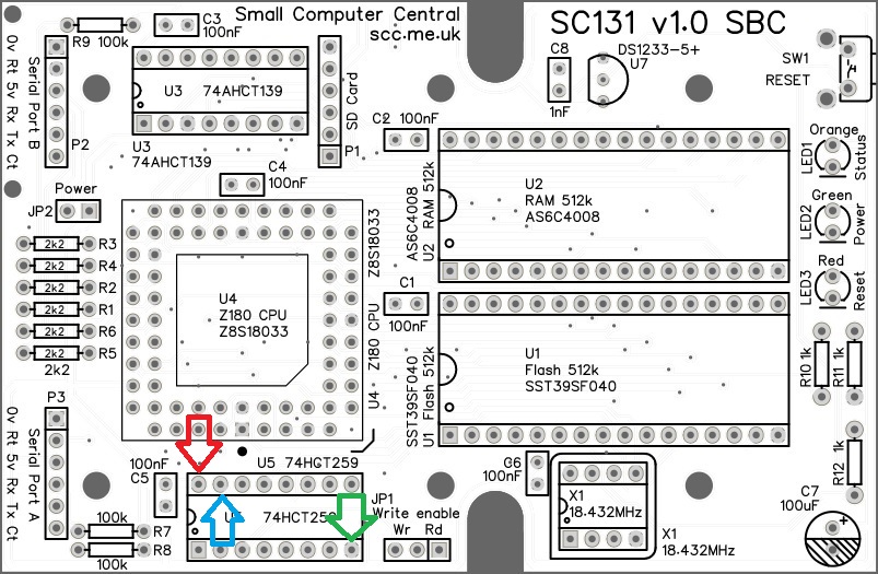 - The voltage between U1 pin 31 (WR to Flash) and U5 pin 8 is below 0.5 volts but rises to above 4.5 volts when a jumper shunt is fitted to the read only “Rd” position of JP1. Without the shunt fitted the signal is floating, so with a digital meter it may not be stable but should be below 0.5 volts.