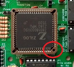 Fit the Z180 CPU into its socket as illustrated to the right. This must be fitted the correct way around. The socket and IC both have a small chamfer in the position indicated.