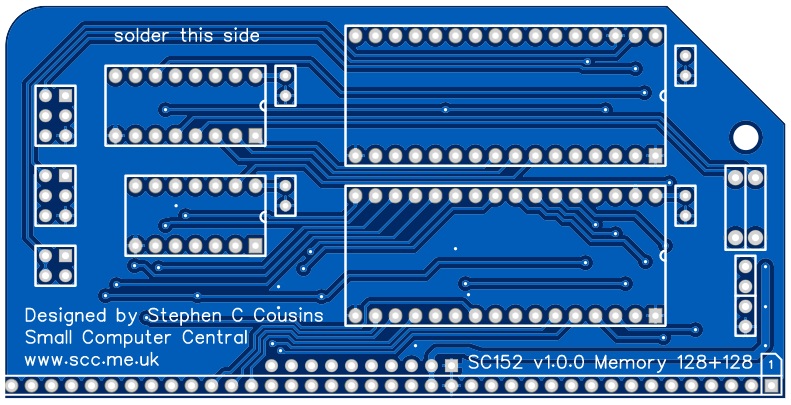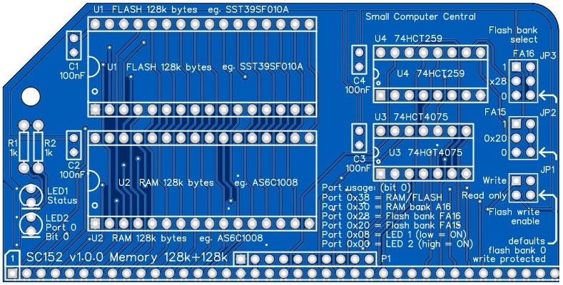 SC152 is a memory module with 128k bytes of FLASH ROM and 128k pages of RAM designed for the RC2014 bus. This module provides suitable memory for running CP/M. It is fully functional on a standard backplane (40 pin), an enhanced backplane (60 pin) and an extended backplane (80 pin).