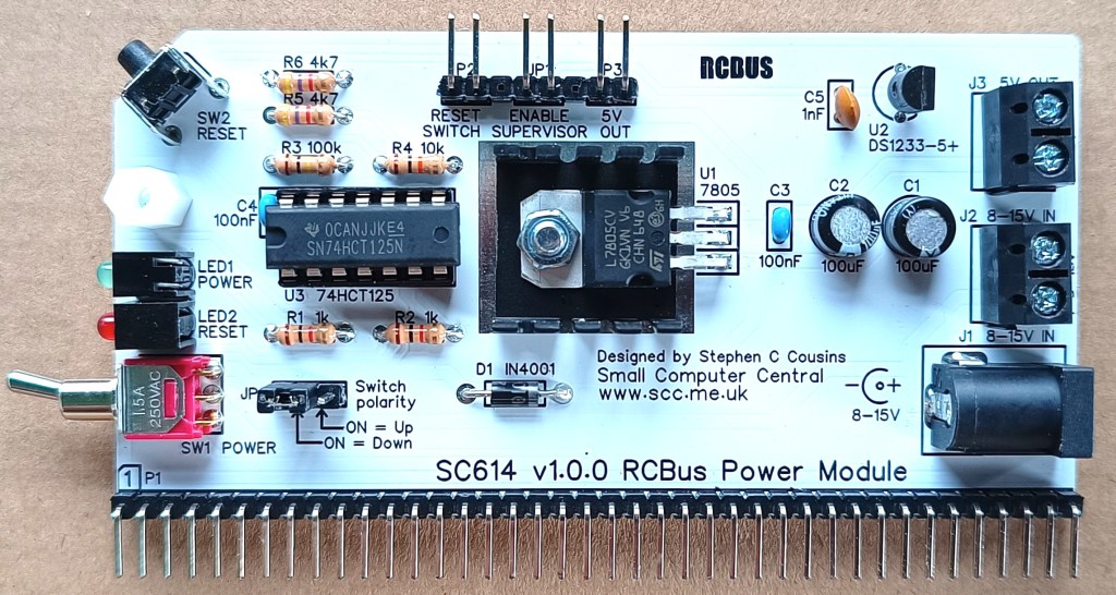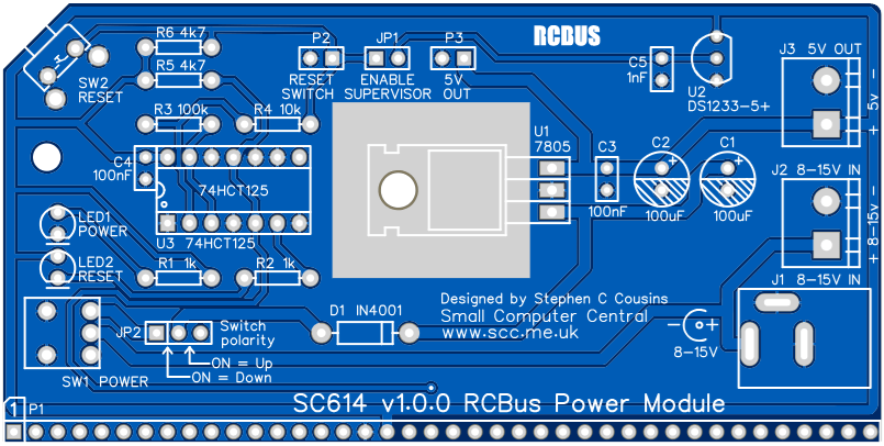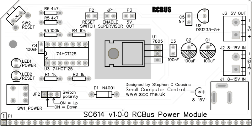 This module provides a regulated 5-volt supply to the backplane. Voltage input is between 8 and 15 volts D.C. at a maximum of 1 ampere. The regulator will get warm in normal use. The higher the input voltage and the greater the current load, the hotter it will get. The input can be connected to either J1 (centre positive) or the screw terminal J2.
