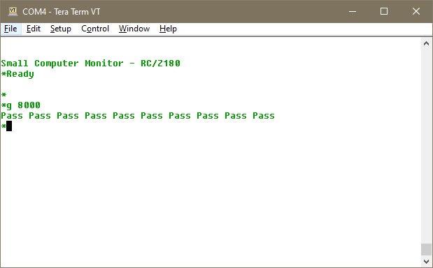 The program is now in memory but has not yet been executed. Typically, the program code starts at 0x8000. To execute the program, type the command “g 8000”. This means GO to location 8000 hex.