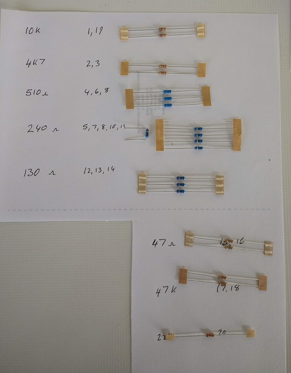 I started assembly by fitting, but not soldering, the resistors. I then checked them against the supplied picture before soldering.