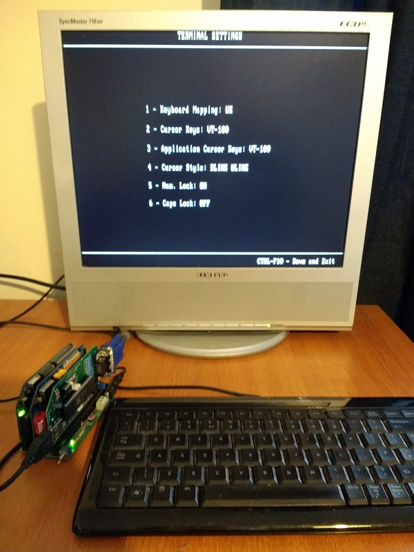 This module has been designed for RC2014 by Marco Maccaferri. It provides VGA text at 80×25 with 16 colors, ANSI / VT-100 terminal emulation, and USB keyboard support.