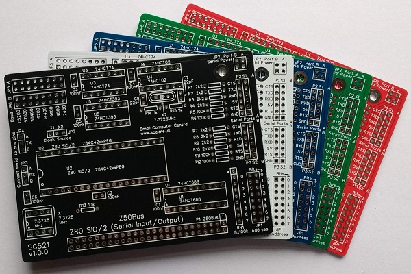 SC500 series PCBs are offered in a range of colours as individual boards and as parts of kits. In addition, the design files are available for you to have your own boards manufactured in other colours.