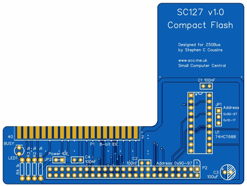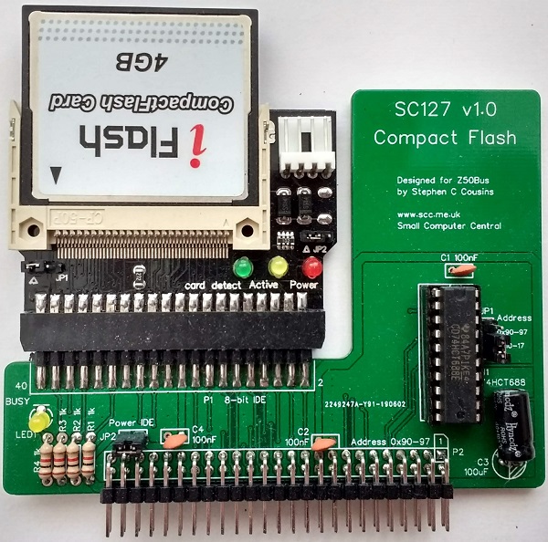 The device plugged into P1 (20 pin, 8-bit IDE) can be either self powered or it can take power from SC127. The recommended Compact Flash adapter module must be powered from SC127.