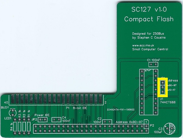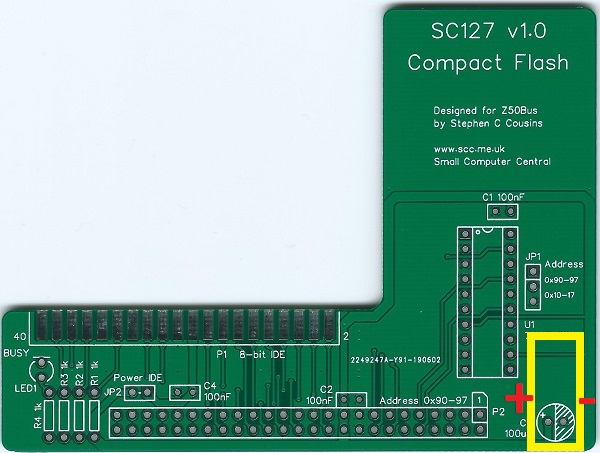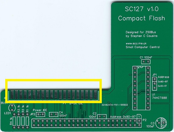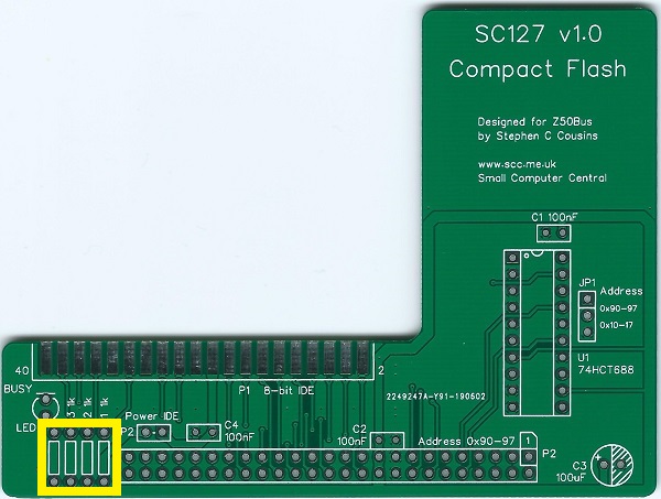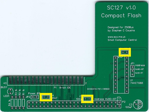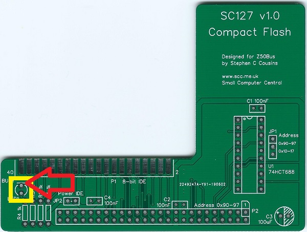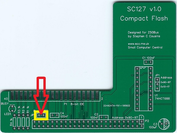 As it is very likely the connected device will need to be powered from SC127, JP2 has a track connecting its two pads. Thus the jumper header and jumper shunt are optional. If fitted, the track between the pads of JP2 must be cut. This track is on the component side of the PCB. If JP2 is present then fit a jumper shunt to provide power the to IDE connector, P1.