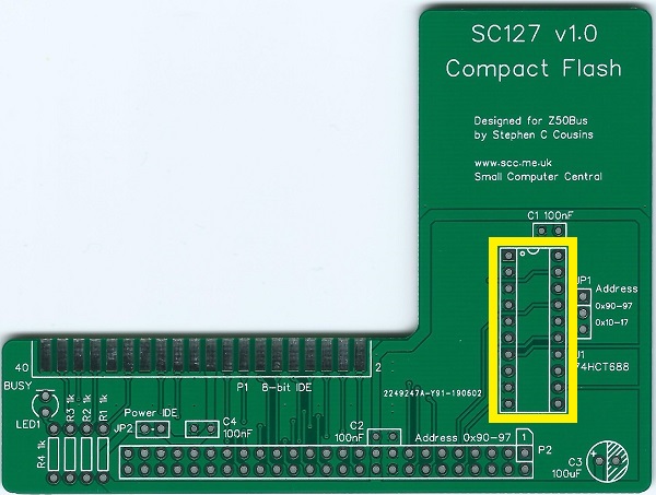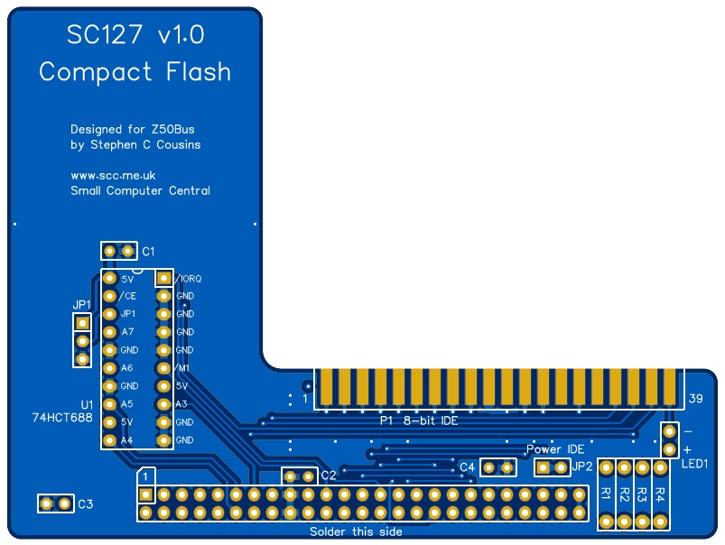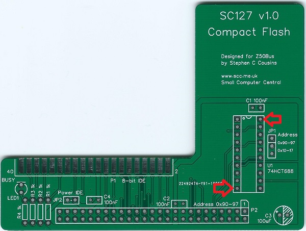 Power is supplied to the IDE header via JP2. Thise does not need to be fitted if you are using the recommended Compact Flash adapter module as there is a track between the jumper pads. If you wish to fit a jumper then cut the track first. After that, go ahead and populate the board. There shouldn’t be any further surprises to catch you out.