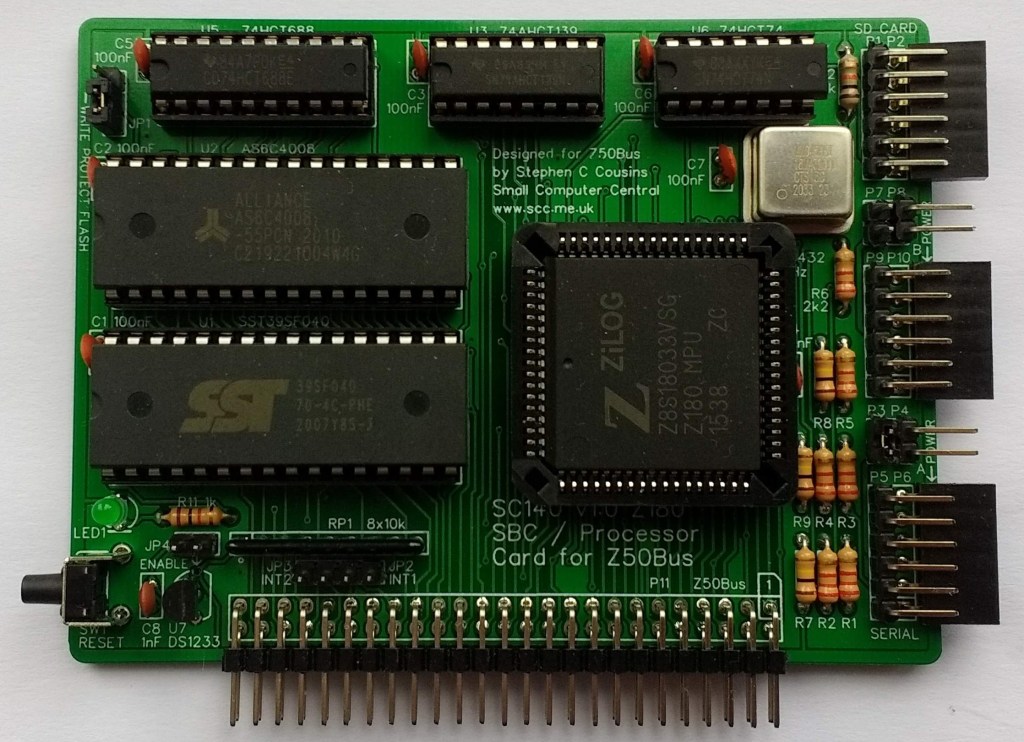 SC140 is a Z180 based Single Board Computer in the Z50Bus card form factor. It can be used on its own as a Single Board Computer or it can be plugged into a Z50Bus backplane for expansion.