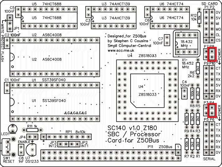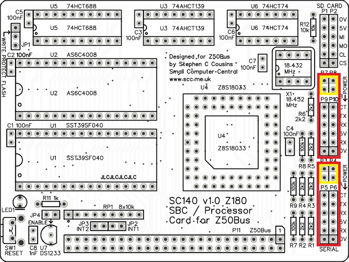 An alternative way to power SC140 is to plug it into a powered Z50Bus backplane. In this case you are unlikely to want jumper shunts fitted to connect power to or from the serial ports.