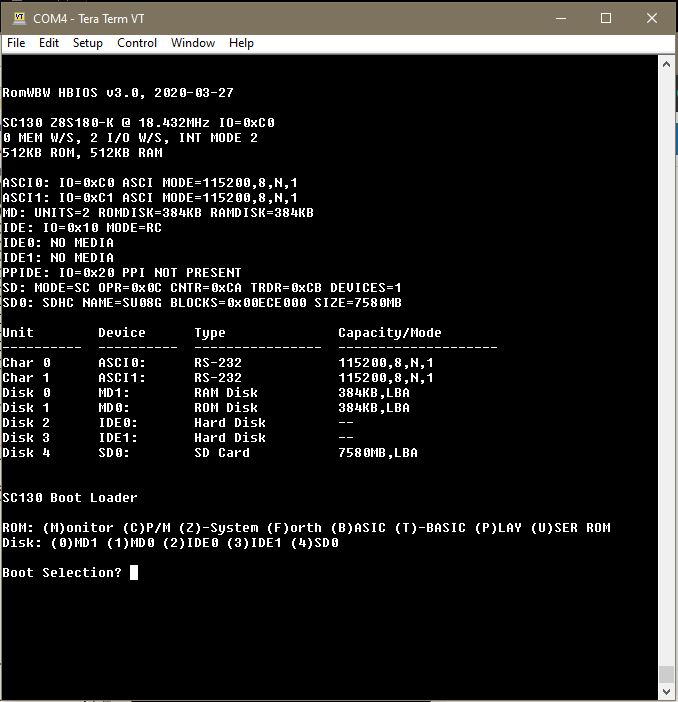 - RomWBW, configuration SCZ180_sc140. This configuration supports an SD card for mass storage.