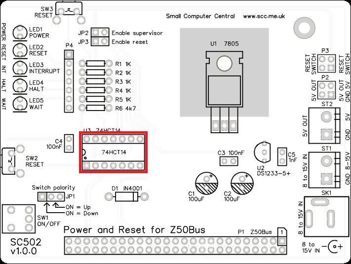 Insert the integrated circuit (74HCT14) into the socket, taking care to insert it the right way around, as illustrated below. Be careful not to bend any legs over.