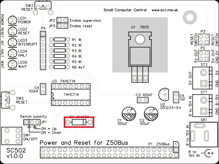 With the PCB on a non-conducting surface, connect a power supply to either SK1 or ST1. SK1 is a 2.1 mm barrel socket (centre positive) and ST1 is a screw terminal block. The power supply should provide between 8 and 15 volts D.C. and be able to source 300 mA or more. Note, an expanded system may require up to 1000 mA (1 ampere).