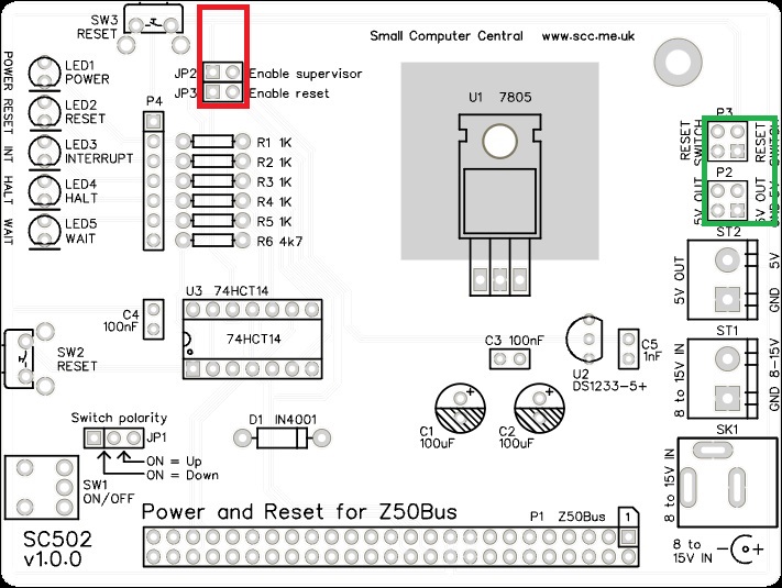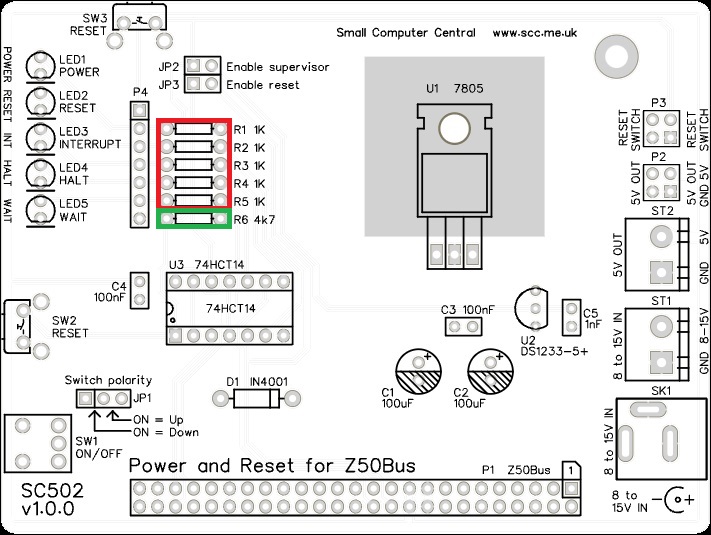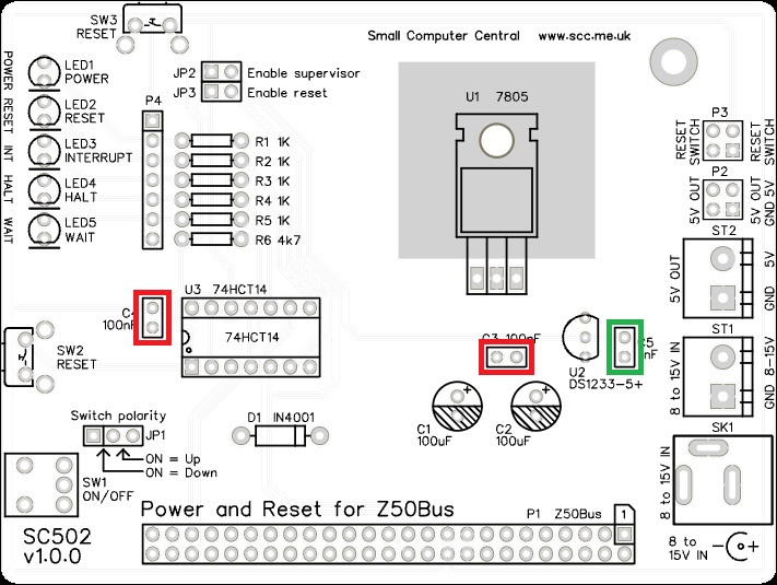 Turn on again and you should see the reset LED (LED2) light for about 0.5 seconds and then it should turn off. The LED lights for a short while following switch on as the voltage supervisor and reset device (U2) generates a nice clean reset signal. If the reset LED stays on it usually indicates the 5 volt supply is less than about 4.75 volts.