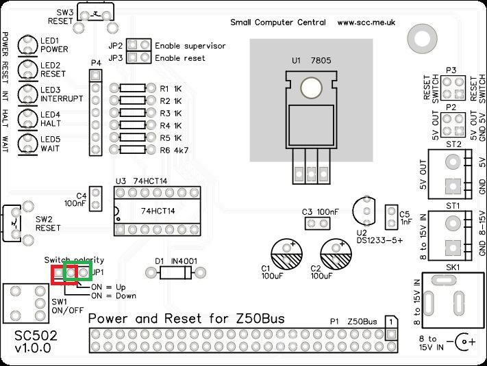 JP1, usually a wire link, enables the on/off toggle switch polarity to be set. Different parts of the world have different standards for on and off. Some use UP for ON, while others use DOWN for ON.