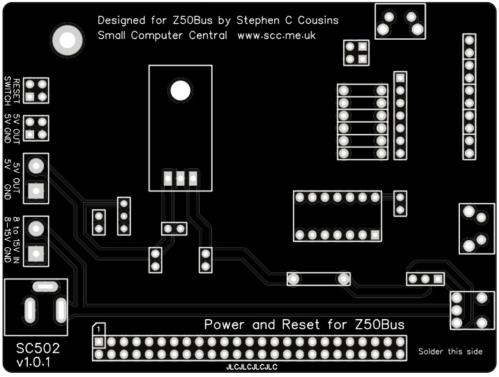 This card provides power and reset for a Z50Bus system. It also includes status indicator LEDs .