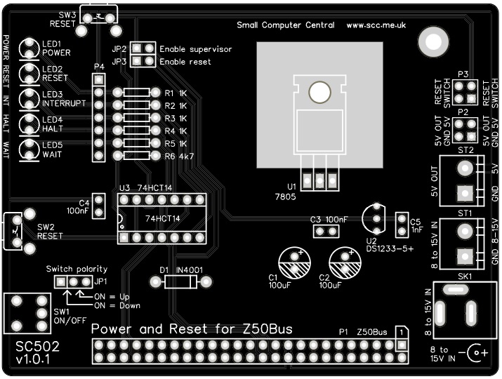 SC502 is a power supply, reset, and status card designed for Z50Bus.