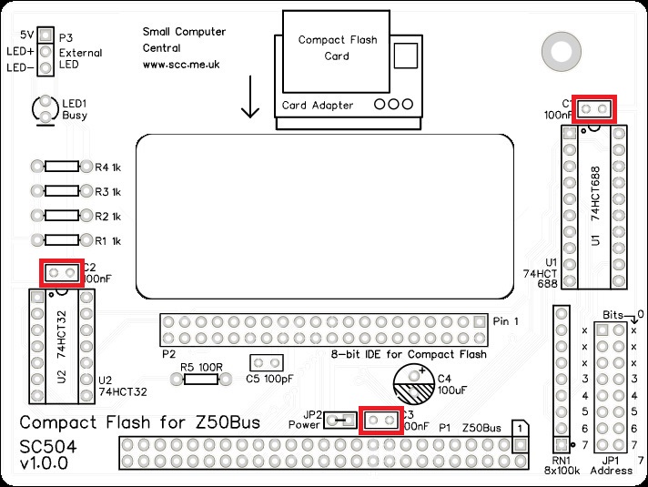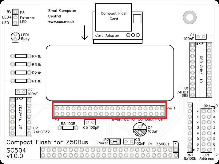 The device plugged into P2 (20 pin, 8-bit IDE) can be either self-powered or it can take power from SC504. The recommended Compact Flash adapter module must be powered from SC504.