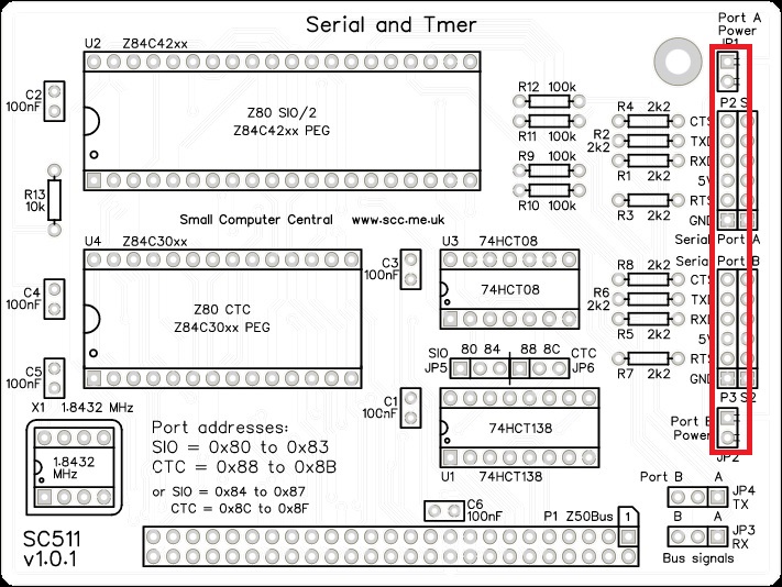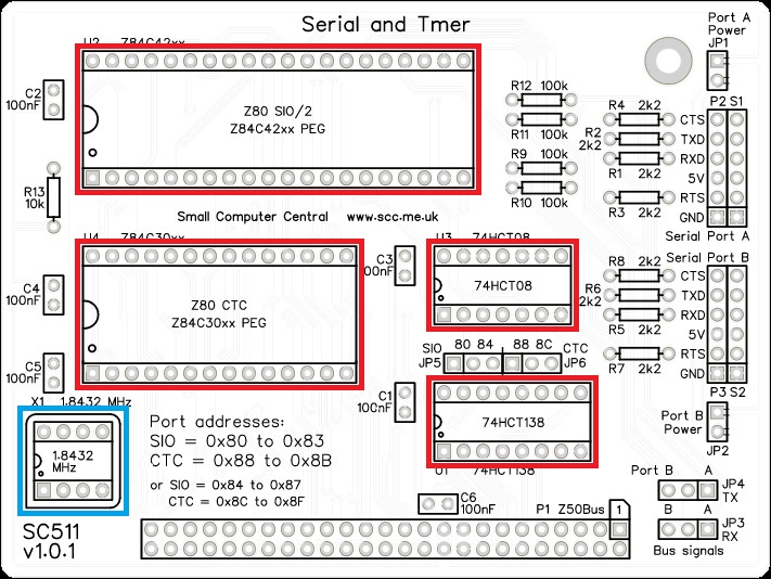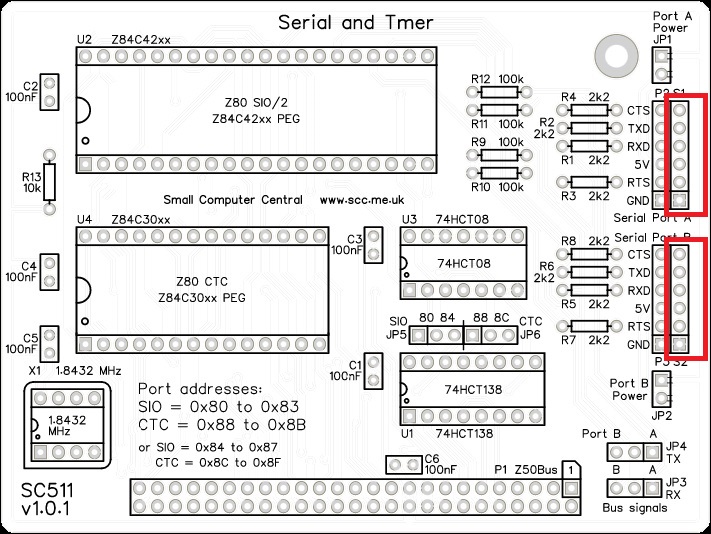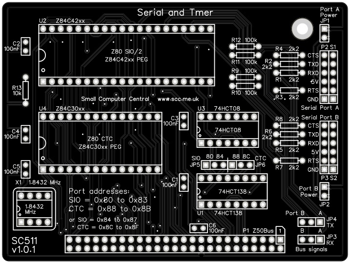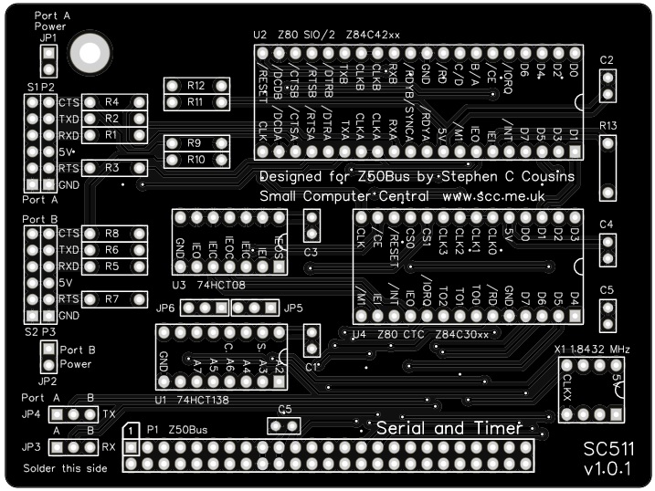 The SC511, serial and timer card houses a Z80 SIO chip, which provides two TTL serial ports for use with FTDI style serial adapter cables, and a Z80 CTC, which has four counter/timer channels.