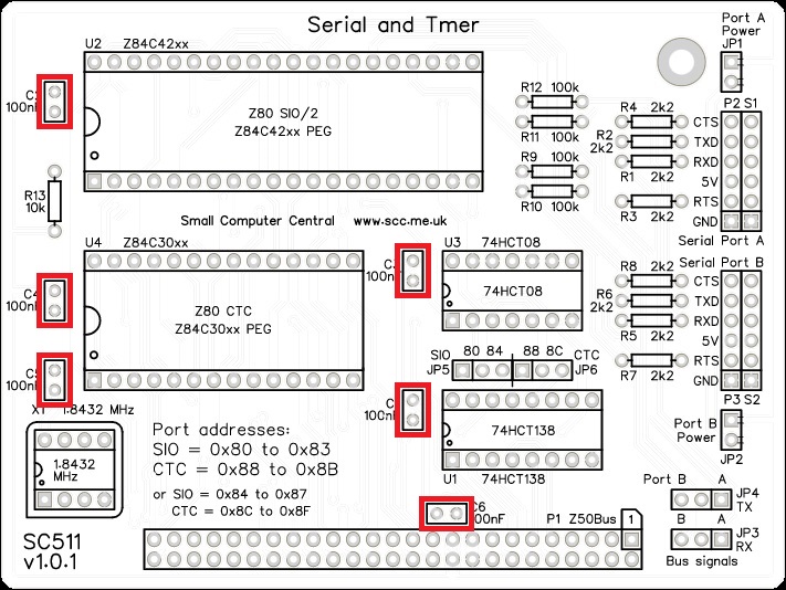 Fit a jumper shunt to JP5 and another to JP6, in the positions shown below in red. These select the default address for the SIO and CTC chips.