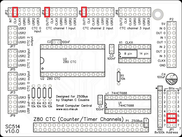The recommended base address is currently 60 hex (01100000 binary) when used as part of an SC500 system. This address is selected by fitting jumper shunts for bits 6 and 5. A CTC at this address is not used by any current system software, such as for the system timer or baud rate clock generator.