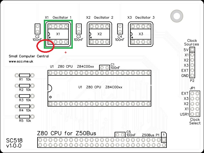 - Oscillator X1 (half-size 8-pin DIP ‘can’ oscillator)