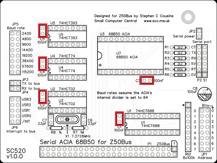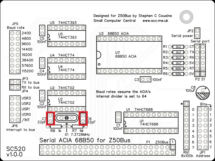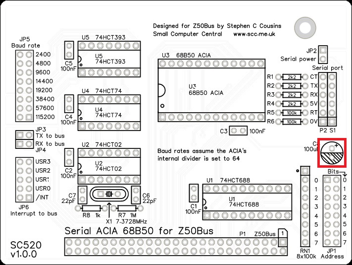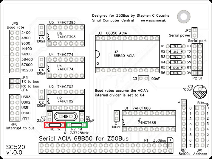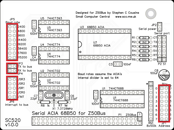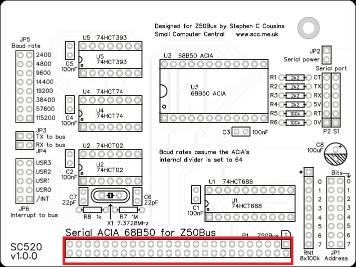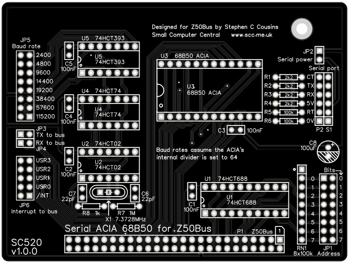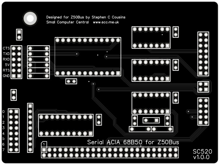 The SC520, serial card houses a 68B50 ACIA chip, which provides a TTL level asynchronous serial port for use with FTDI style serial adapter cables.